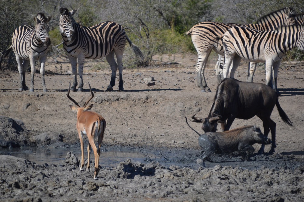 We stopped at a hide for lunch, one of the few areas we can get out and walk around. The hide is a fenced in path and a building with small narrow windows, so you can see the wildlife without them seeing you. This one was right next to a watering hole. Being winter, which is the dry season here, there was only a little water in the watering hole, but this was still the largest amount in one area for several kilometers. Being the only place to find water, it was busy. We saw zebra, warthogs, wildebeest, nyalas, impalas, and some kudu all together sharing the area. Busy day!