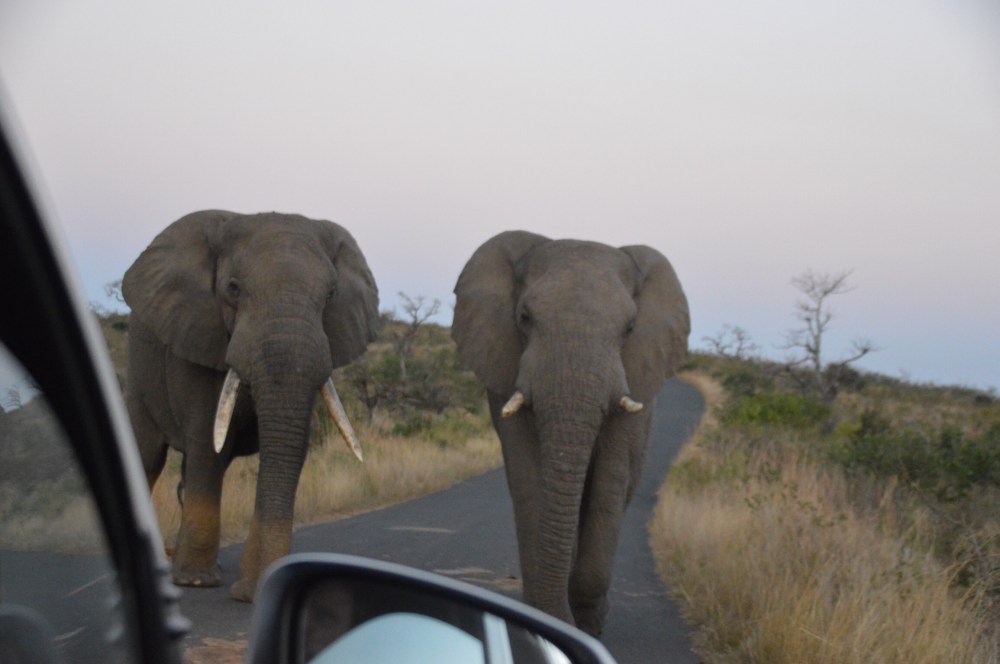 We had to race back to Hilltop before the gates closed at 6 pm, which was a few hours of driving from us at the time. We were making good time and would have made it by probably 5:15. But you know how it goes- the moment you have to get somewhere is when you run into that obstacle that is determined to make you late. In our case that obstacle was a pair of grumpy bull elephants. See? I told you I’d talk more about elephants.